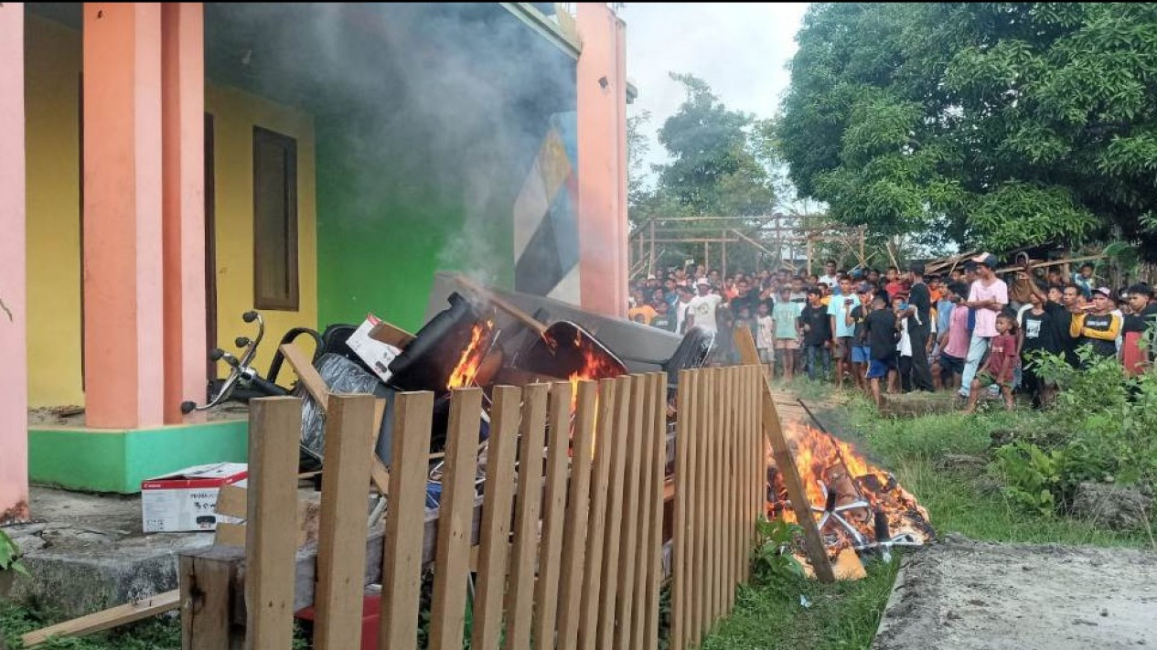Puluhan massa berasal dari masyarakat Desa Buano Utara, Huamual Belakang, Kabupaten Seram Bagian Barat, Maluku, membakar kantor desa dan kotak suara pilkades