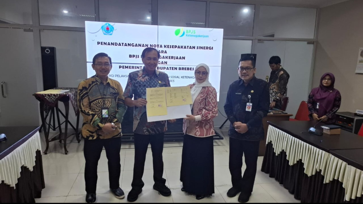 tvOnenews.com - Badan Penyelenggara Jaminan Sosial (BPJS) Ketenagakerjaan melakukan penandatanganan Nota Kesepahaman (MoU) bersama Pemerintah Kabupaten (Pemkab) Brebes terkait sinergi pelaksanaan Jaminan Sosial Ketenagakerjaan. Penandatanganan ini dilakukan oleh Pj Bupati Brebes, Iwanuddin Iskandar, dan Kepala BPJS Ketenagakerjaan Cabang Tegal, Endah Rahmawati, di Kantor Pelayanan Terpadu, Kabupaten Brebes, pada Kamis, 25 Juli 2024.