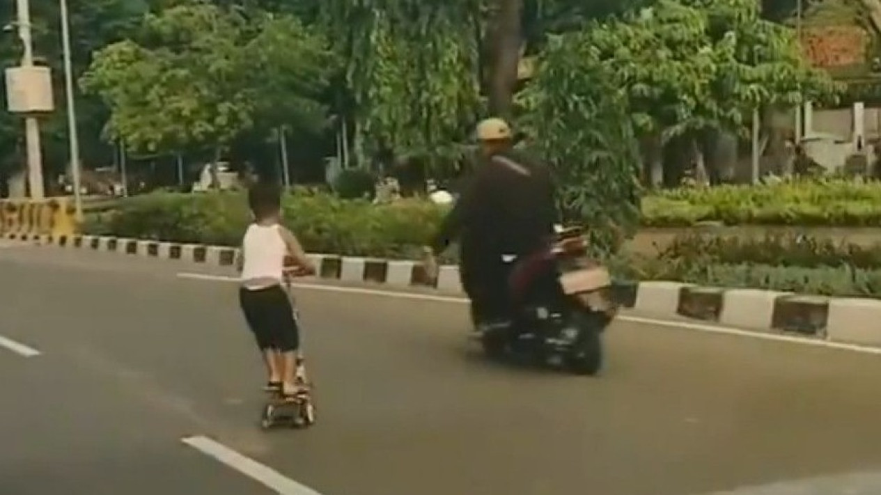 "Moments seorang anak main scooter hingga ke jalan raya hingga membuat kagok para pengendara untuk hindari sang anak tersebut. Nampak para pengendara motor coba membantu sang anak untuk minggir di jalan kiri, namun sang anak kembali melintas ke kanan jalan," tulis akun tersebut.
