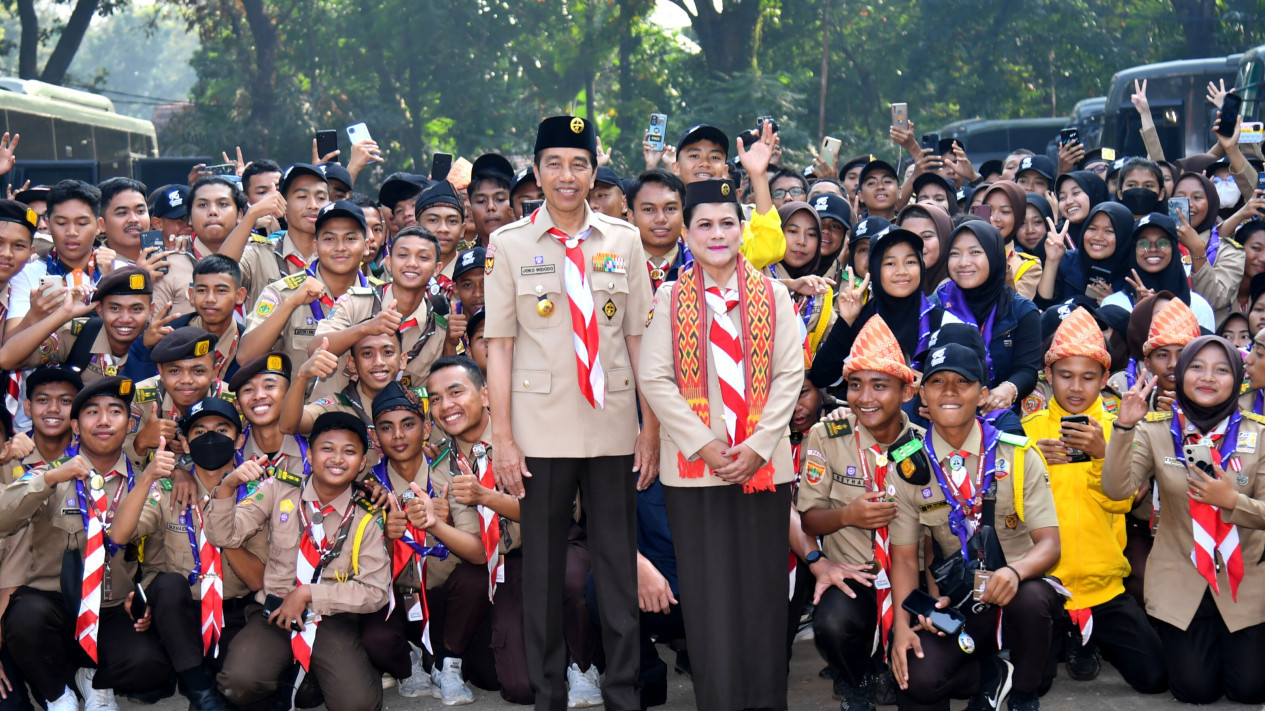 Jakarta, tvOnenews.com - Presiden Joko Widodo dan Ibu Iriana Joko Widodo meninjau langsung kegiatan Raimuna Nasional XII Gerakan Pramuka Tahun 2023 yang digelar di Bumi Perkemahan Pramuka Cibubur, Jakarta, pada Selasa (15/8/2023). Berseragam Pramuka lengkap, Presiden dan Ibu Iriana tiba di lokasi kegiatan sekitar pukul 07.26 WIB.
