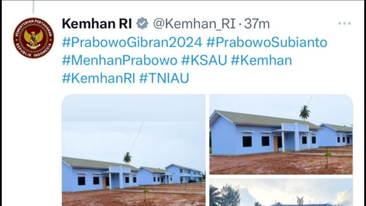 Jakarta, tvOnenews.com - Cuitan akun X Kemhan RI mendadak ramai dikomentari netizen. Pasalnya ada netzien yang memberikan tangkapan layar akun X Kemhan RI memposting foto dengan tagar #PrabowoGibran2024. Padahal akun X Kemhan RI sedang memposting peresmian rumah untuk anggota TNI AU.