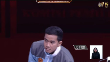 Setelah waktu habis, Gibran pun meledek dengan bahasa tubuhnya menengok kepala ke kanan dan kiri sembari mencari.
