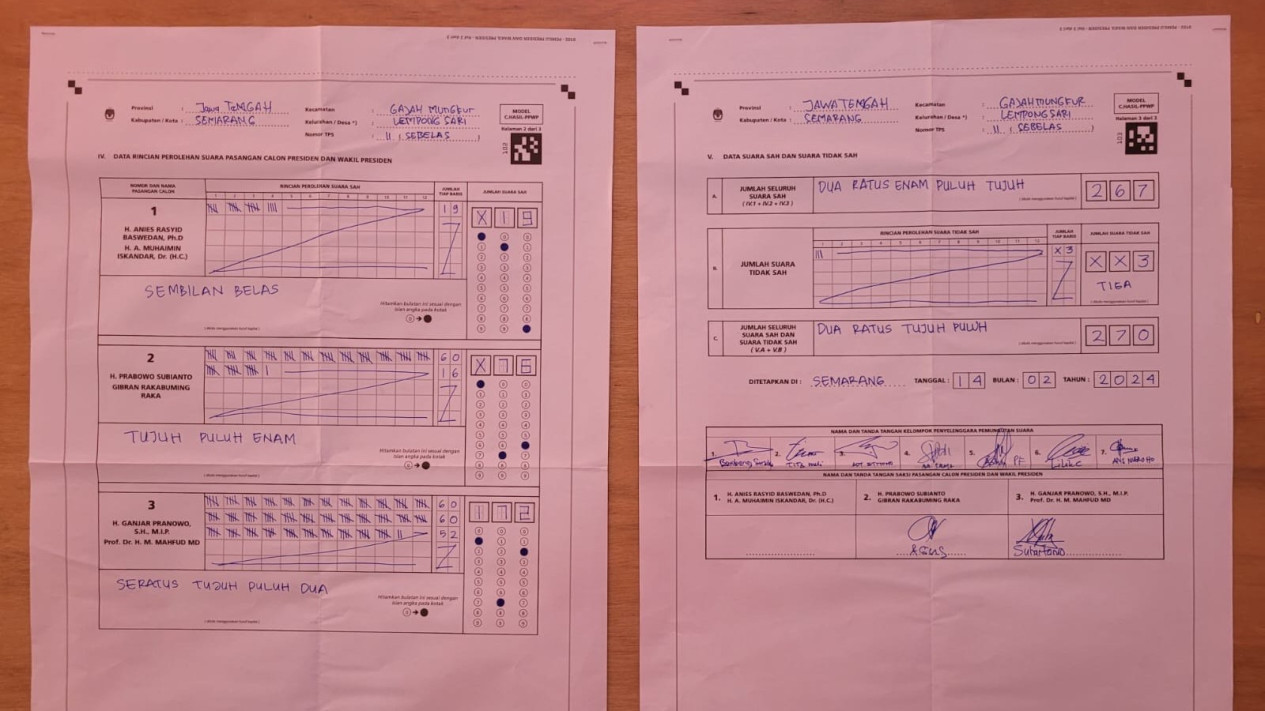 Berdasarkan informasi yang diterima dari Ketua Kelompok Penyelenggara Pemungutan Suara (KPPS), Bambang Sarjito, Ganjar-Mahfud memperoleh 172 suara, Prabowo-Gibran 76 suara, dan Anies-Muhaimin hanya 19 suara.