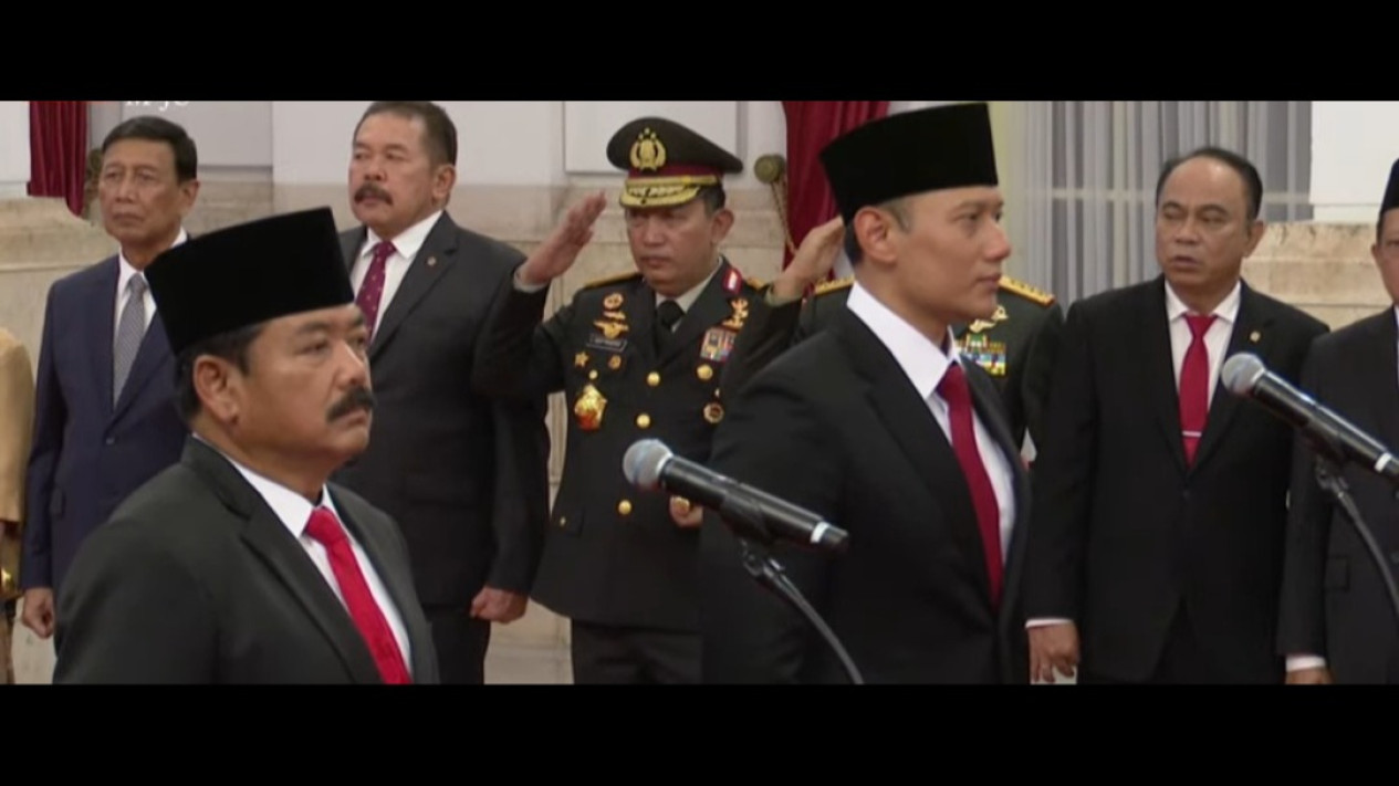 AHY mengucap sumpaj jabatan di hadapan Presiden Jokowi dan kabinet Indonesia Maju.
