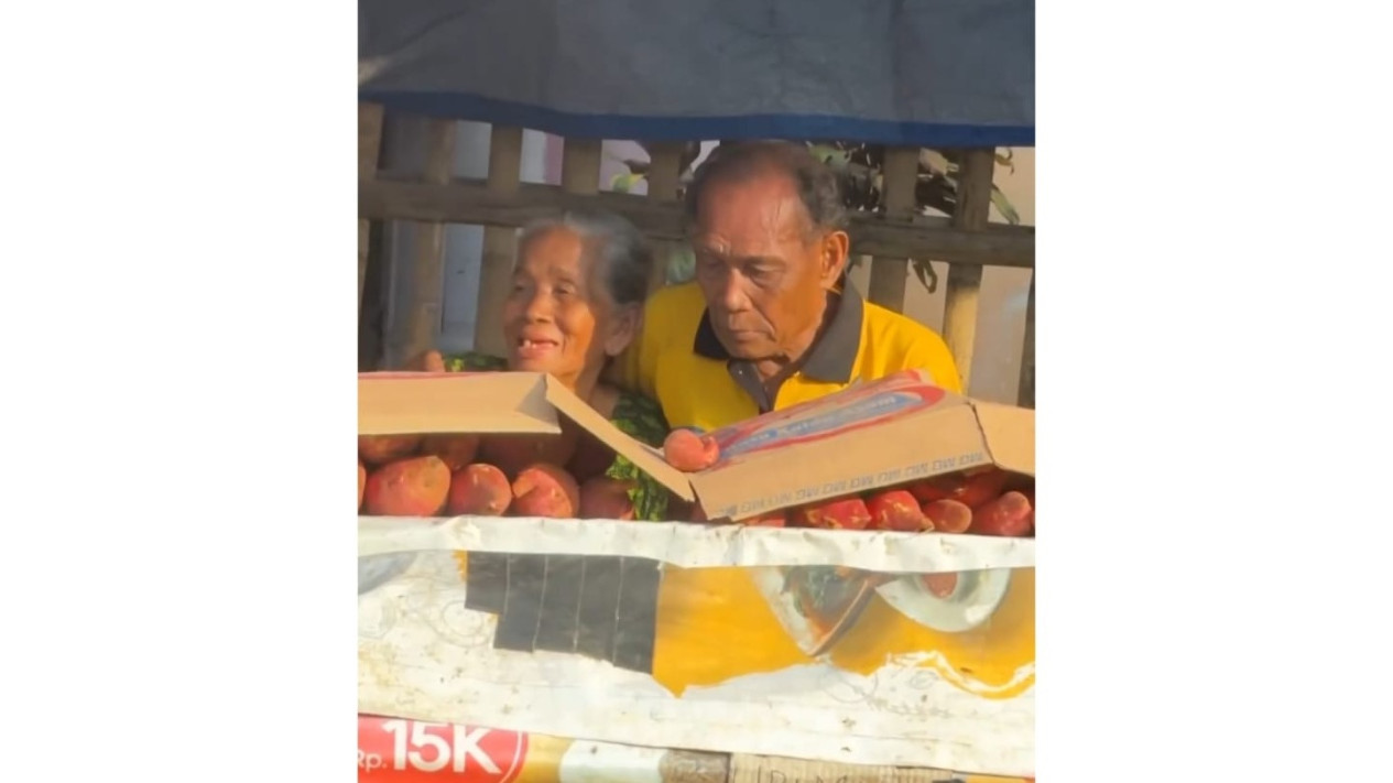 Pria itu lalu mendatangi seorang kakek dan nenek penjual ubi. Sebelum didatangi pria itu, kakek dan nenek tersebut tampak sedang menunggu pembeli.