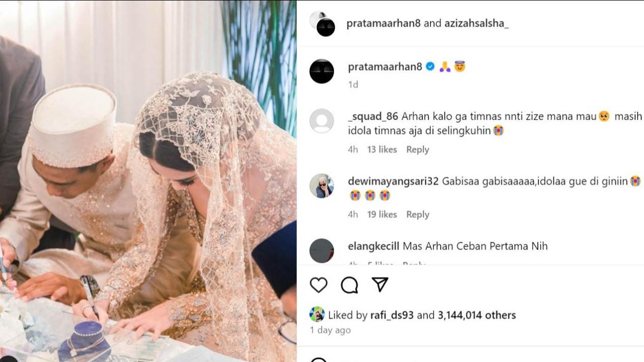 Foto pernikahan Arhan dan Zize ini langsung disukai 3,1 juta orang dan dikomentari oleh 963 ribu orang.