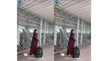 Azizah tampak mengenakan gamis dan khimr berwarna merah maroon, serta kacamata hitam dan masker putih. Azizah juga tampak mendorong koper hitam.