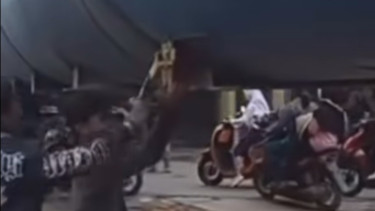 Kondisi macet itu membuat beberapa pengendara roda dua nekat melintas lewat kolong truk. Sejumlah warga lainnya turut mengingatkan bahwa itu adegan berbahaya.