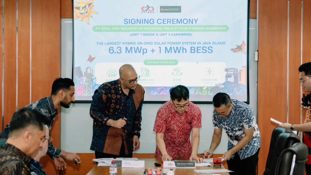 Surabaya, tvOnenews.com – PT Steel Pipe Industry of Indonesia Tbk (SPINDO) menjalin kerja sama dengan iForte Energi Nusantara dalam pengembangan pembangkit listrik tenaga surya (PLTS) di lingkungan operasional perusahaan.