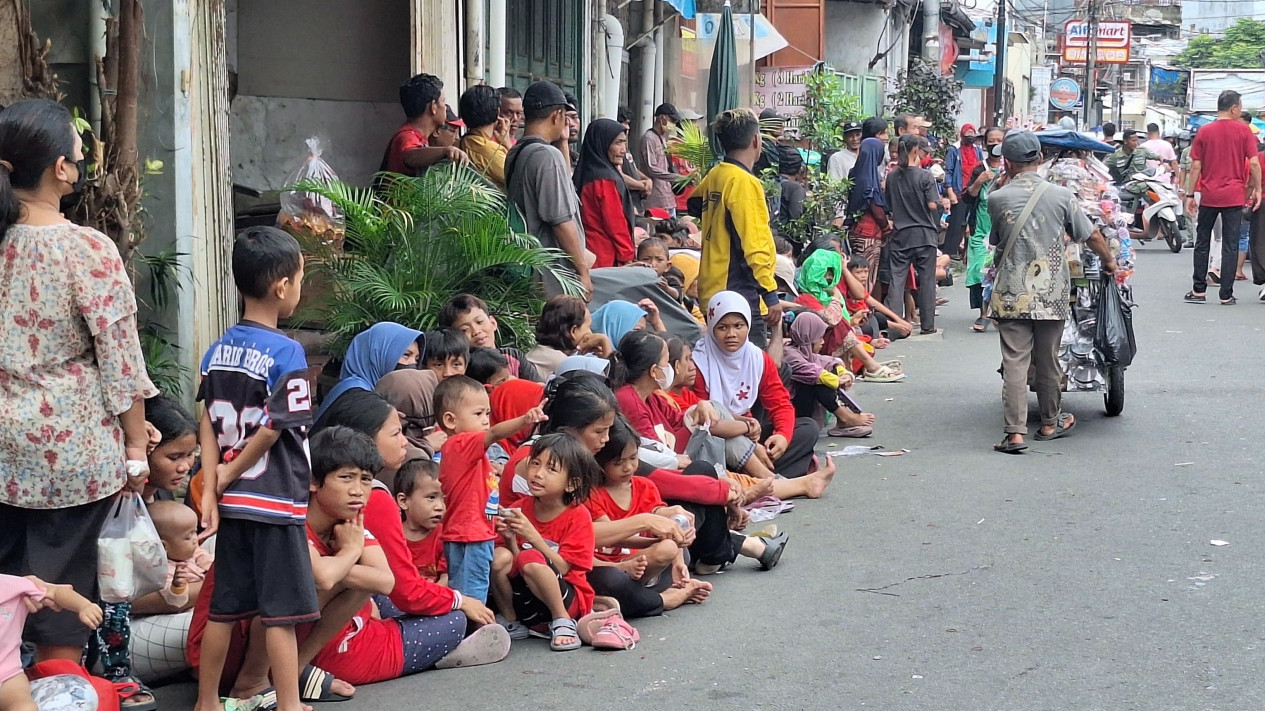 Jakarta, tvOnenews.com - Puluhan warga dari berbagai usia duduk berjejer di sepanjang Jalan Kemenangan, kawasan Petak Sembilan Pecinan Glodok, Jakarta Barat, Selasa (17/2/2026). Mereka terdiri dari anak-anak sampai orang tua.
