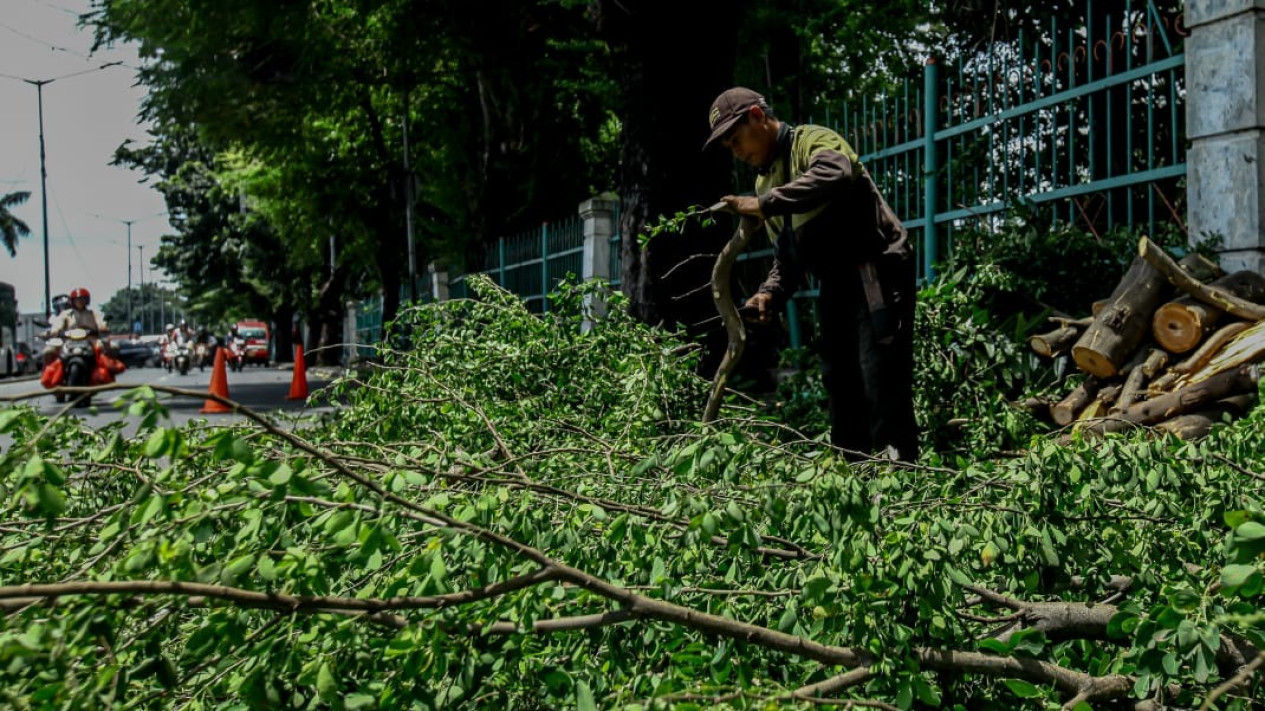 Berita Foto: Petugas PPSU Lakukan Pemangkasan Pohon di Jakarta Timur
