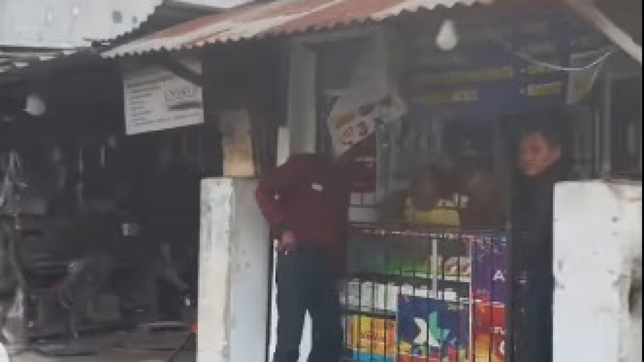 Tak lama setelahnya, pengemudi motor ini lagaung melemparkan toples berisi oli tersebut ke arah toko. Tampak di toko terdapat dua orang diduga tengah membeli tramadol, dan satu orang berada di dalam toko diduga penjual.
