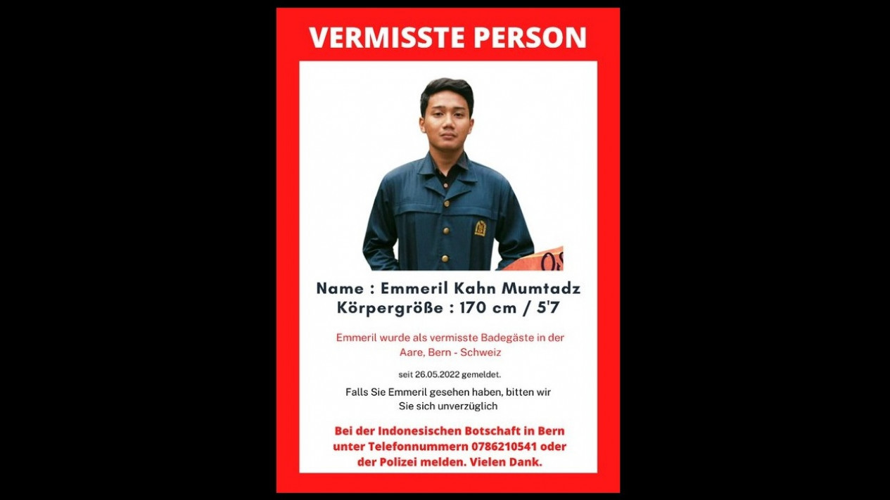 “Emmeril dinyatakan hilang saat sedang berenang di Sungai Aare, Bern, Swiss. Dilaporkan hilang sejak 26 Mei 2022. Jika Anda melihat Emmeril, silahkan hubungi kami segera. Laporkan ke KBRI Bern di 0786210541 atau ke polisi. Terima kasih banyak,” tulis keterangan poster itu.