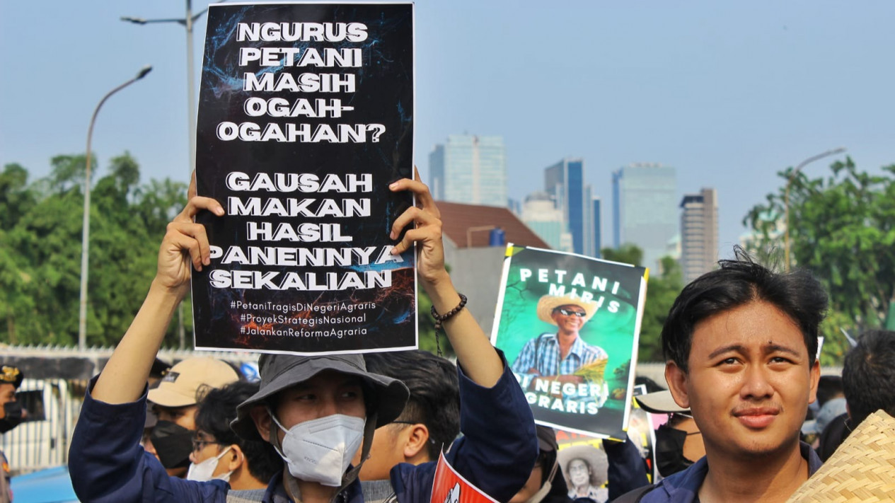 Adapun diantara mereka membawa sejumlah poster bertuliskan 'NGURUS PETANI OGAH-OGAHAN? GAUSAH MAKAN HASIL PANENNYA SEKALIAN!,' dan 'PETANI MIRIS DI NEGERI AGRARIS', 'TANAH UNTUK INVESTOR,'.
