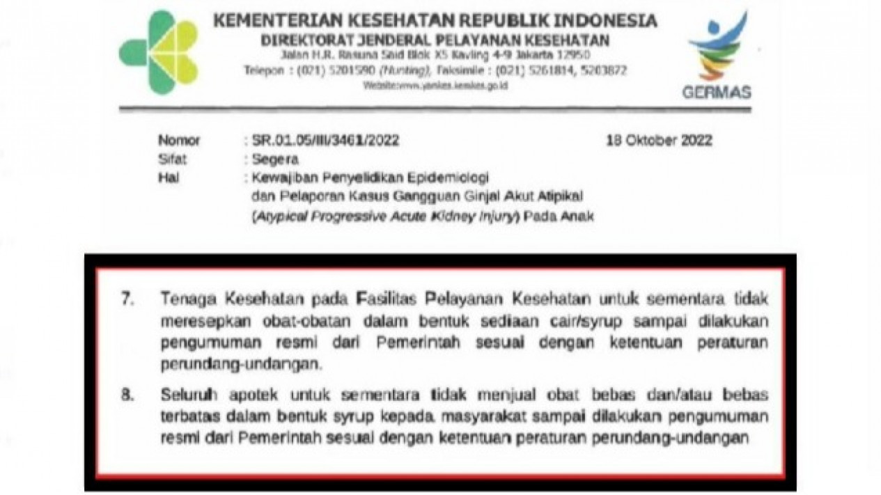 Sejumlah poin dalam surat edaran yang dikeluarkan Kemenkes menyebutkan, jika untuk sementara waktu apotek tidak diperkenankan untuk menjual obat dalam bentuk sirop, menyusul terus meningkatnya penyakit gagal ginjal akut pada anak.