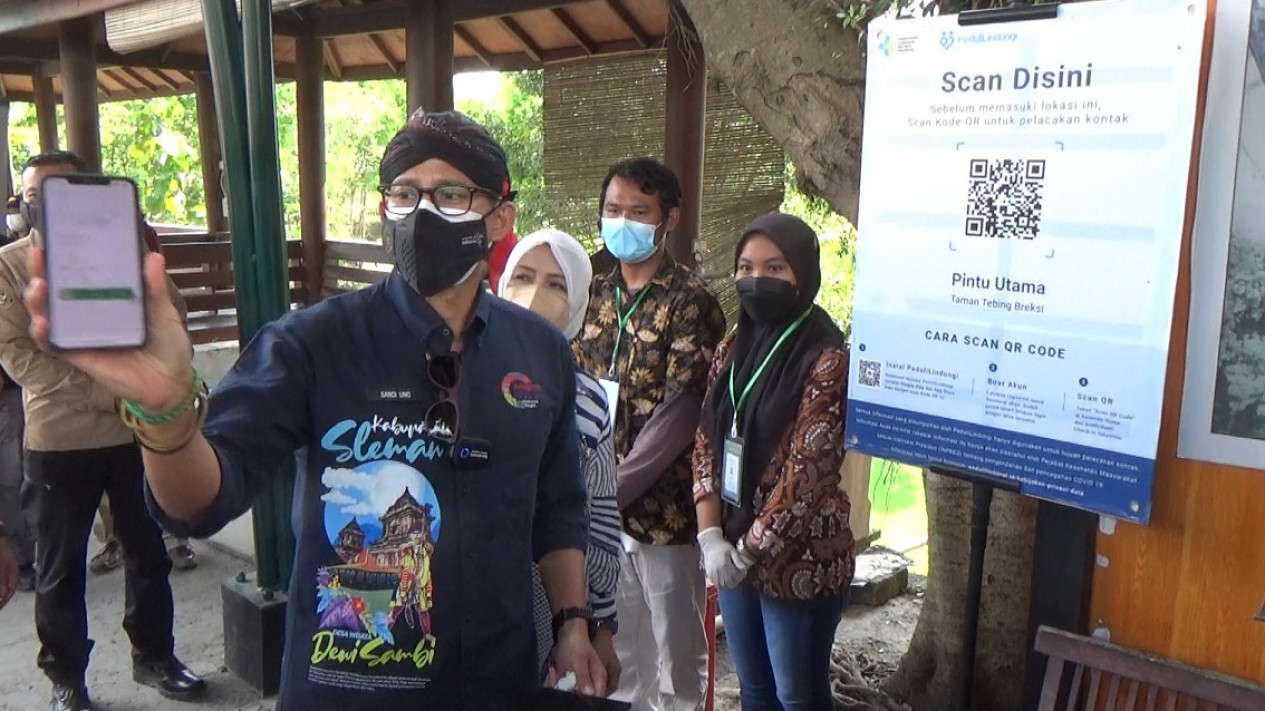 Saat tiba, Sandi langsung mencoba aplikasi PeduliLindungi yang menjadi syarat masuk ke objek wisata. Ia juga melakukan pembelian tiket secara online.