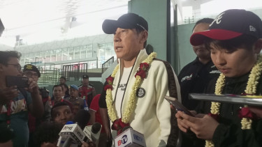 Shin Tae-yong bersama Skuad Garuda Muda tiba di Bandara Soekarno Hatta, Tangerang pada Sabtu (11/5/2024).
