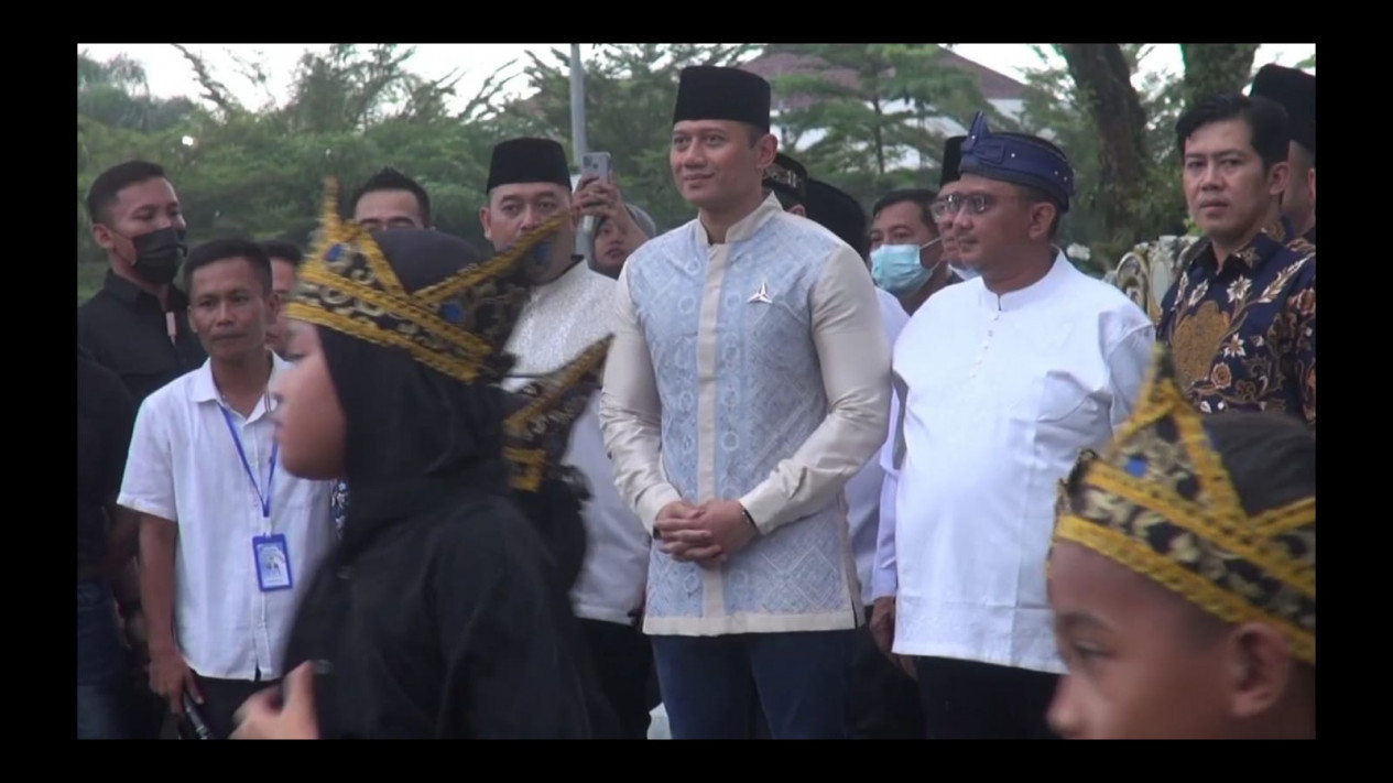 Kabupaten Sumedang, Jawa Barat - Ketua umum Partai Demokrat, Agus Harimurti Yudhoyono bersafari politik ke wilayah Kabupaten Sumedang. Kedatangan AHY, disambut ratusan warga masyarakat di Alun-alun Sumedang Jawa Barat, Rabu (29/03/23) petang.