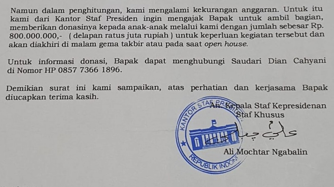 "Namun dalam penghitungan, kami mengalami kekurangan anggaran. Untuk itu kami dari Kantor Staf Presiden ingin mengajak Bapak untuk ambil bagian," demikian bunyi surat itu.