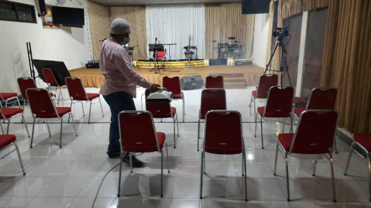 “Malam ini kita lakukan sterilisasi dan penyemprotan cairan desinfektan guna antisipasi penyebaran covid-19,”kata penanggung jawab rangkaian kegiatan Jumat Agung dan Paskah Gereja Sidang Jemaat Allah Immanuel, Krishandrika Immanuel Raharjo Kamis (14/4/2022) malam.