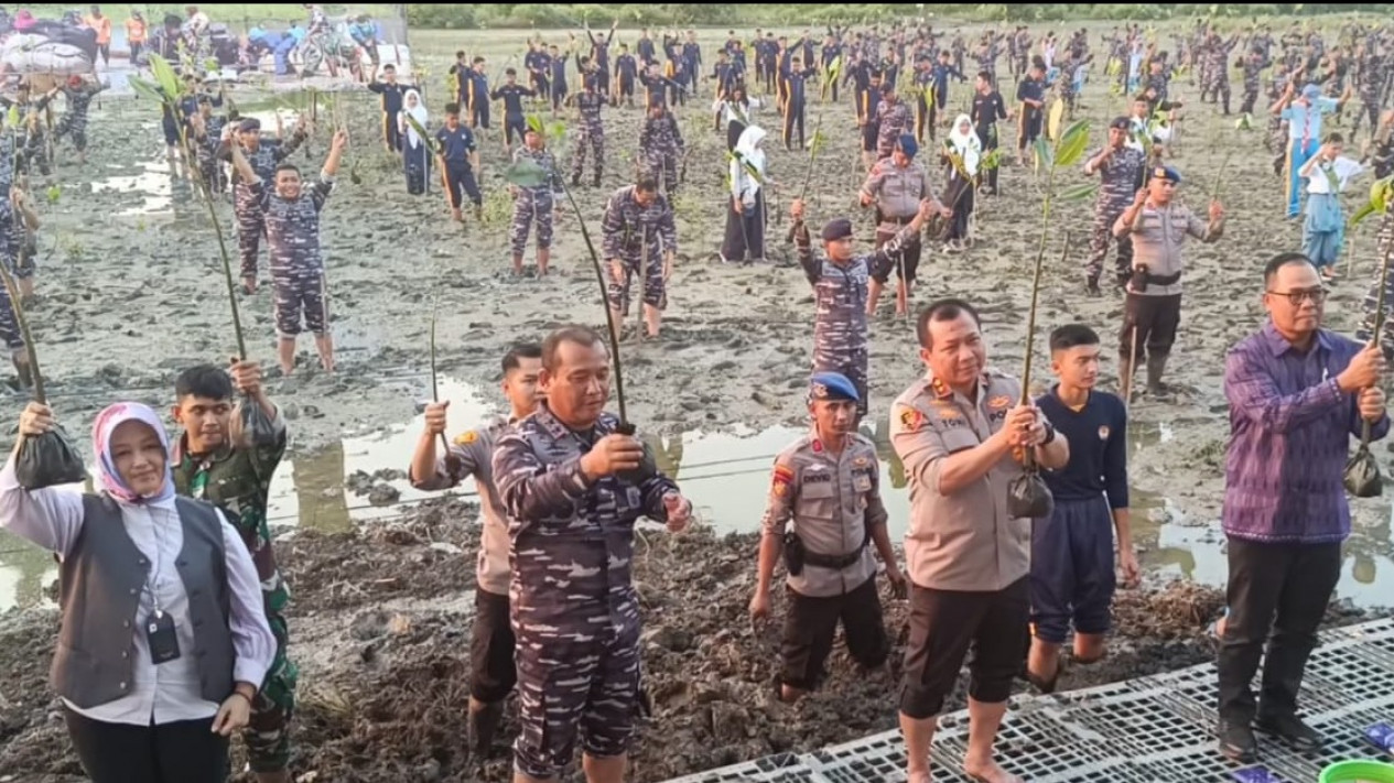 Penanaman mangrove itu berlangsung di pesisir pantai Semampir Koarmada II Surabaya. Tak tanggung-tanggung, 20 ribu bibit pohon mangrove ditanam.