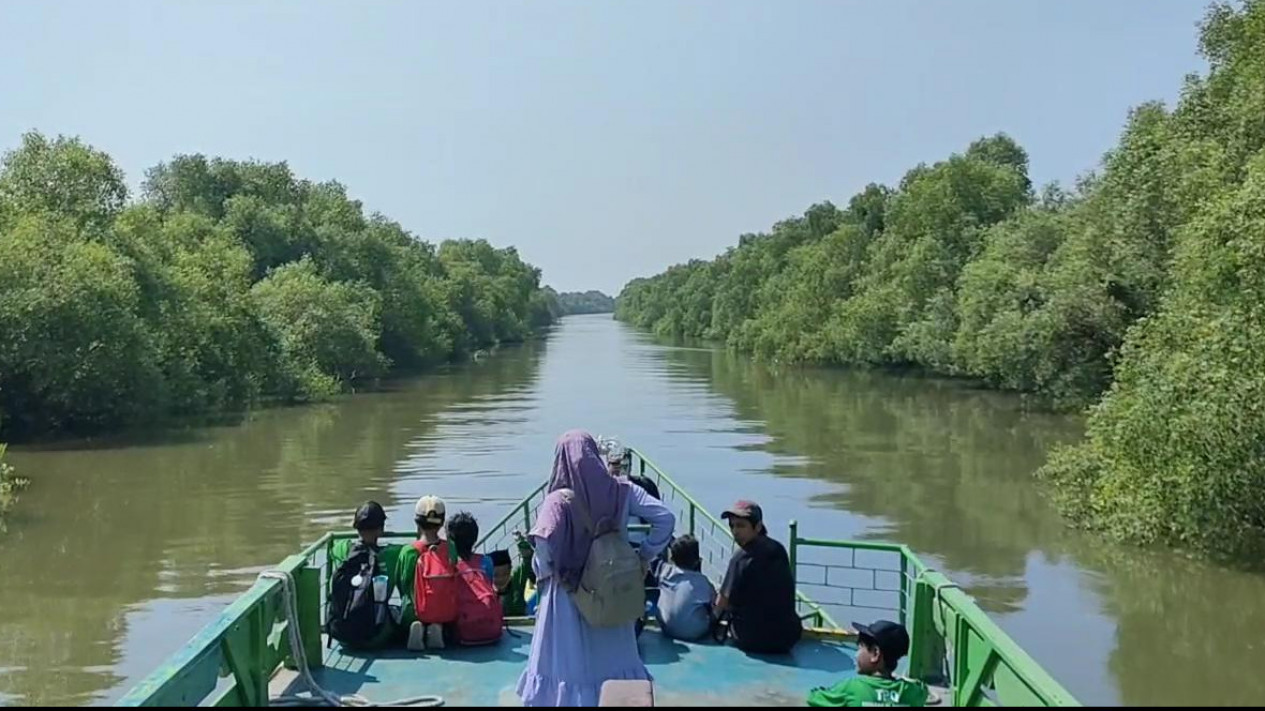 Dengan menaiki perahu, para santri ini diajak menyusuri sungai sepanjang 5,4 kilometer selama kurang lebih 15 menit. Sepanjang perjalanan mereka disuguhi pemandangan hutan mangrove nan asri dan sejumlah satwa liar, seperti bangau, kera, dan kucing hutan, yang terkadang muncul.