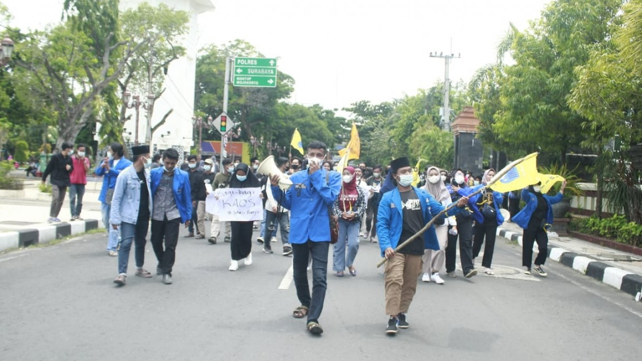 Lamongan, Jawa Timur - Ratusan orang yang mengatasnamakan mahasiswa PMII cabang Lamongan, menggelar aksi unjuk rasa di depan kantor pemkab setempat, Senin (17/01/22). Mereka menuntut pemerintah serius dalam penanganan banjir yang tak kunjung surut di wilayah Bengawan Jero.