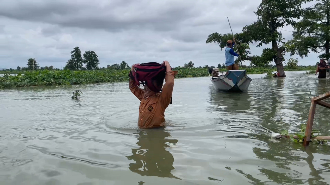 Meski kondisi banjir semakin tinggi, para siswa di Desa Bojoasri tetap nekat berangkat sekolah. Dengan risiko seragam basah kuyup lantaran harus menerjang genangan air, mereka juga bertaruh keselamatan nyawa setiap harinya.