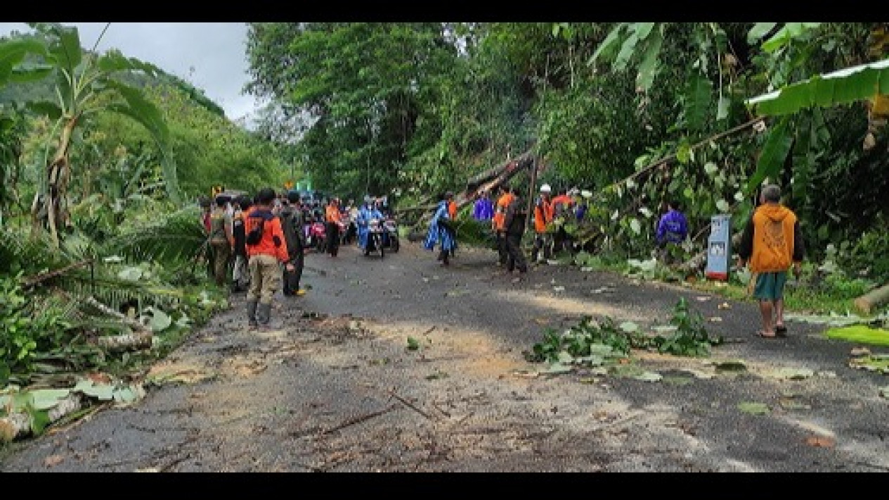 Pacitan, Jawa Timur - Hujan deras yang mengguyur Pacitan membuat akses jalur utama Pacitan-Ponorogo terganggu. Empat pohon di tebing tumbang menutup seluruh badan jalan. Dua titik pohon tumbang berada di kilometer Dusun Grunggung, Desa Gunungsari, Kecamatan Arjosati, dan 1 titik di Desa Tambakrejo, Kecamatan Pacitan.