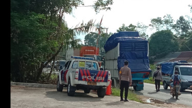 Tebo, Jambi - Petugas pengamanan arus mudik lebaran Idul Fitri 1443 H yang berada di Sungai Bengkal, Kecamatan Tebo Ilir, Jambi, Sabtu (7/5/2022) berhasil mengamankan dua unit truk yang nekat beroperasi menjelang puncak arus balik lebaran. Truk bermuatan mainan odong-odong itu terpaksa harus terparkir usai dihadang anggota kepolisian karena melebihi tonase saat melintas di wilayah Sungai Bengkal.
