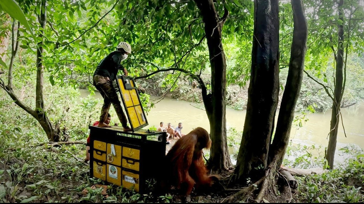 "Orangutan segera keluar, memanjat pohon terdekat, lalu menghilang di rimbunnya pepohonan hutan. Jarak antara evakuasi dan lokasi translokasi ± 14 kilometer," ucap Andar. (Ayr/wna)