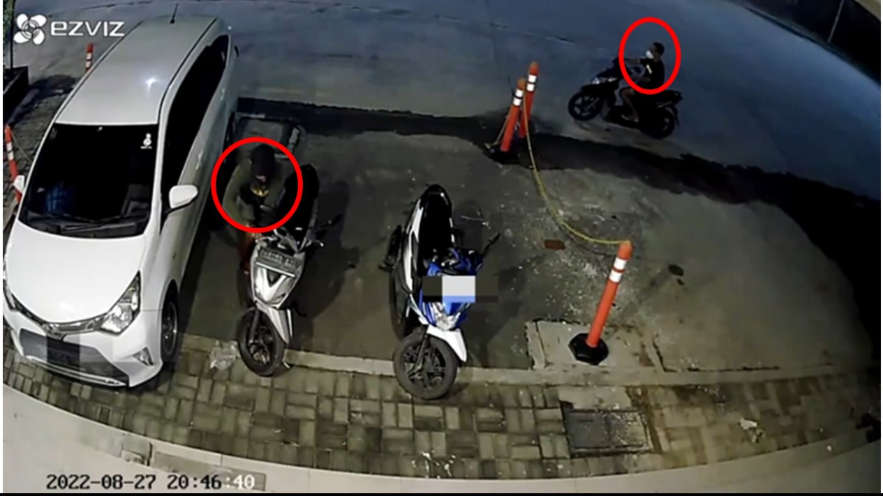 Dari rekaman, dua pelaku terlihat berboncengan berhenti tepat di depan parkiran sepeda motor, kemudian satu pelaku turun dari kendaraannya mencoba mendekati sepeda motor yang manjadi incarannya.