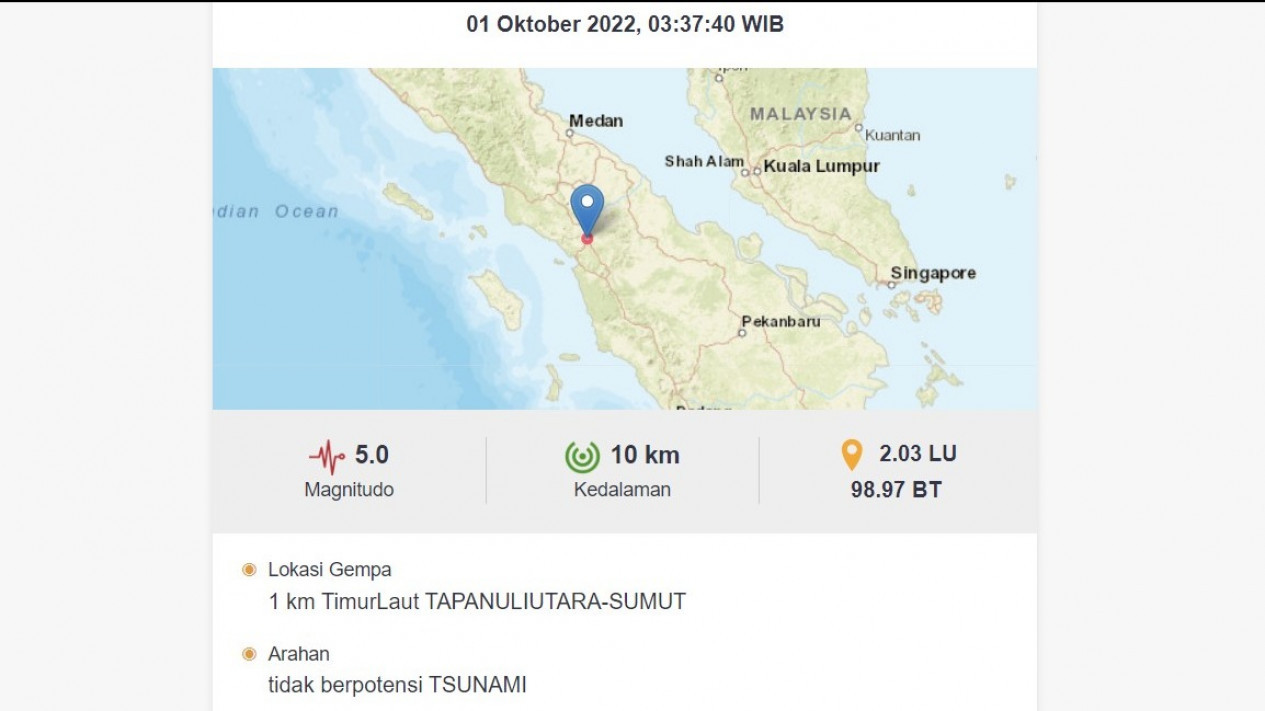 Sebelumnya pada Sabtu, 1 Oktober 2022 pukul 02.28.41 WIB di wilayah Tapanuli Utara, Sumatera Utara diguncang gempa tektonik. Hasil analisis BMKG menunjukkan gempa bumi ini memiliki parameter update dengan magnitudo M5,8.