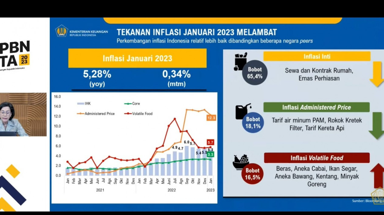Inflasi Januari 2023 sebesar 5,28 persen year-on-year (yoy) atau terjadi peningkatan sebesar 0,34 persen month-to-month (mtm). Kenaikan ini dipengaruhi faktor Core Inflation di level 3,3, Administered Price Inflation di level 12,3, dan Volatile Food Inflation di level 5,7.