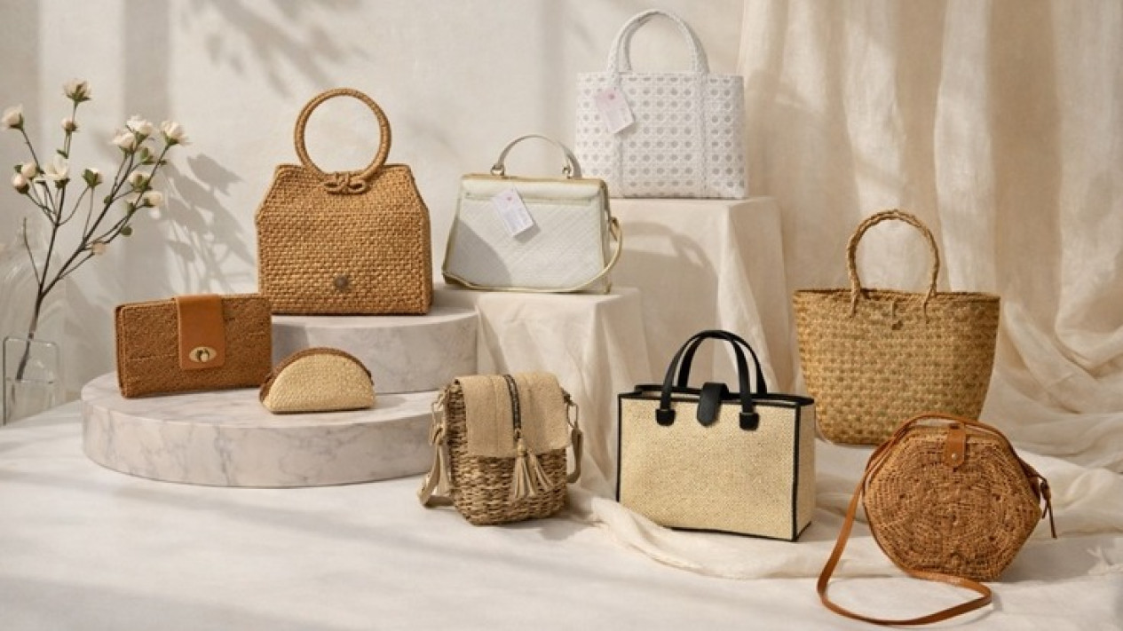 Dengan sentuhan desain modern yang tetap mempertahankan teknik anyaman tradisional, bahan alami tersebut diolah menjadi produk fesyen seperti tas, dompet, dan aksesori.
