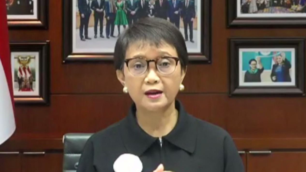 Tangkapan layar Menlu Retno Marsudi menyampaikan keterangan pers secara daring pada Kamis (21/7/2022)..
