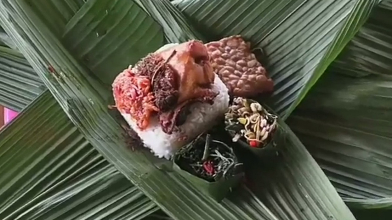 "Nikmat tiada tara. Begitu dibuka, ada nasi, lengkap dengan lauk di atasnya. Biasanya ada sayur pakis, sayur kecambah kedelai hitam, atau oseng teri. Lalu lauknya ada tempe goreng dan ayam goreng atau daging sapi goreng serundeng,"ujarnya.