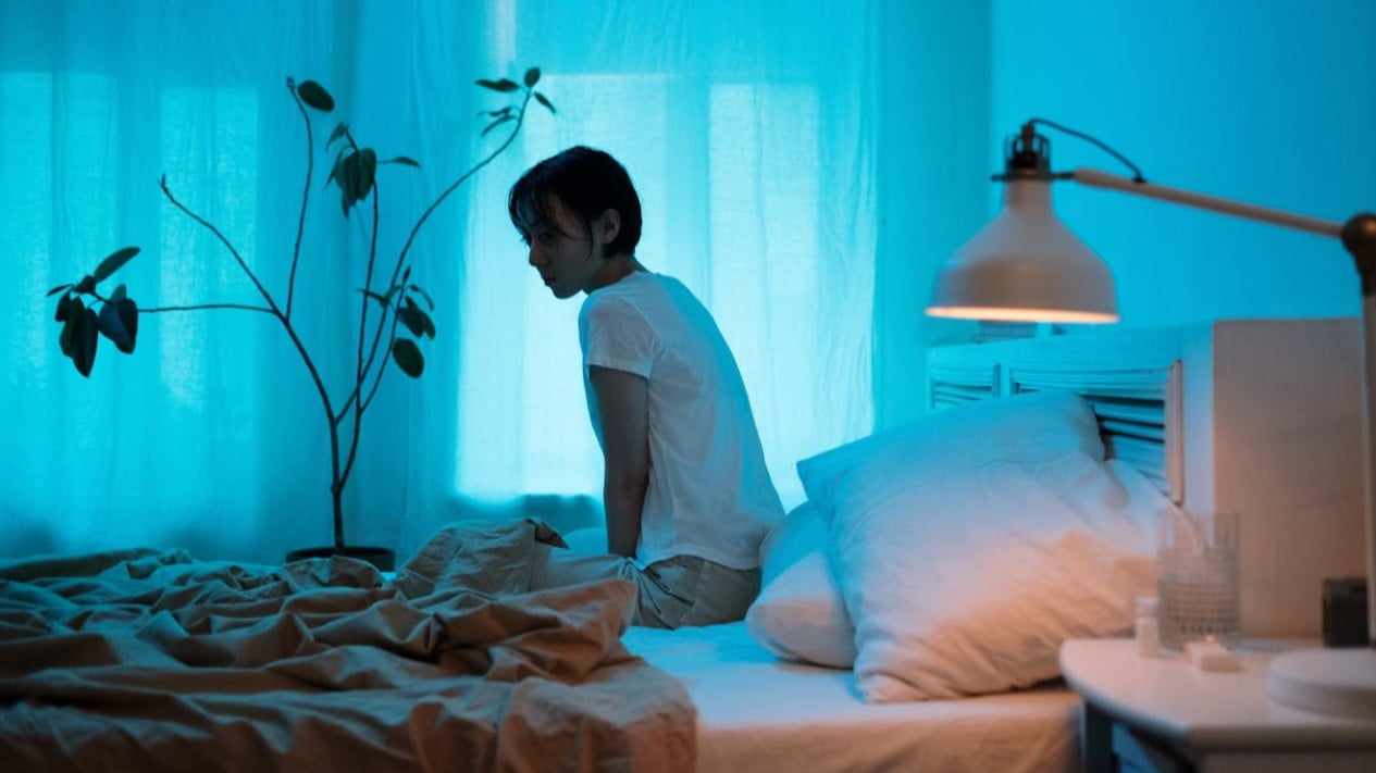 Ilustrasi wanita duduk di atas ranjang.