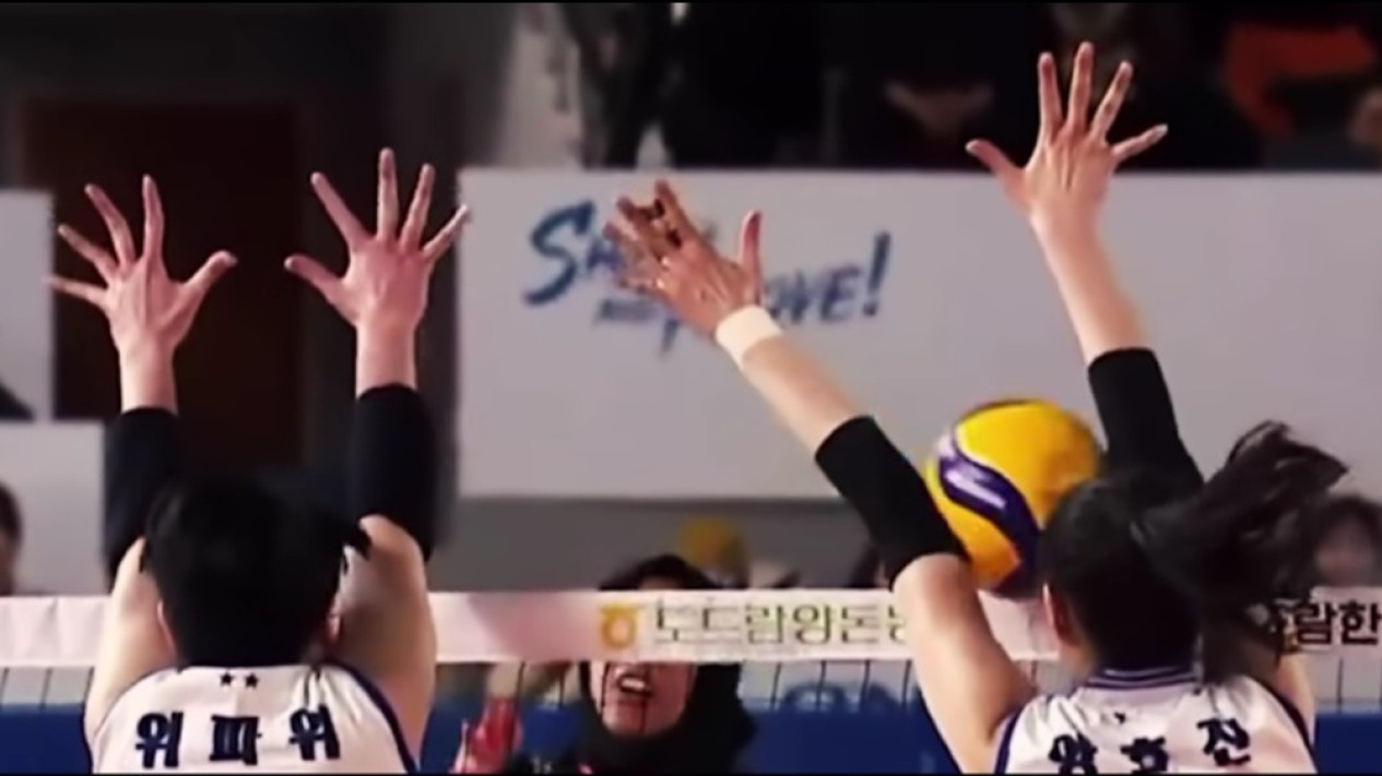 Middle blocker dari Hyundai Hillstate, Yang Hyo-jin mencoba menghadang / mem-block bola tapi tak sengaja malah mengenai mukanya.