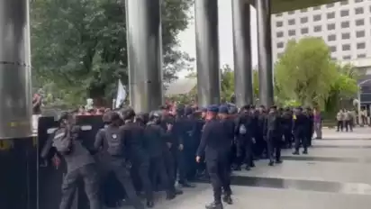 Mereka juga sempat adu dorong dengan polisi yang berjaga. Tim pengamanan bahkan sampai mengeluarkan tameng untuk menahan massa yang memaksa masuk.