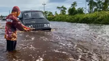 Pulang Pisau, Kalteng - Banjir kembali merendam Jalan Poros Tengah Trans Kalimantan, tepatnya di Desa Penda Barania, Kecamatan Kahayan Tengah, Kabupaten Pulang Pisau, Kalimantan Tengah. Tingginya curah hujan di kawasan hulu sungai, mengakibatkan debit air meningkat dan meluap, Selasa (9/11/2021).
