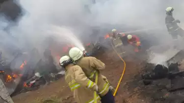 Jakarta - Api membakar lapak limbah plastik dan industri rumahan pabrik penggilingan kapas di Jalan Raya TB Simatupang, Selasa (16/11/2021) pagi. Tempat pembuatan bantal dan kasur yang berlokasi di depan Rumah Sakit Pasar Rebo, Kelurahan Gedong, Jakarta Timur itu hangus. Dinas Penanggulangan Kebakaran dan Penyelamatan (Gulkarmat) DKI Jakarta mengerahkan 13 unit mobil pemadam.