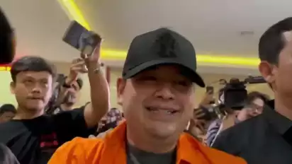 Terpantau buronan Dito Mahendra tiba dengan berseragam baju tahanan berwarna oranye, topi berwarna hutan yang menutupi kepalanya dengan tangan terborgol.