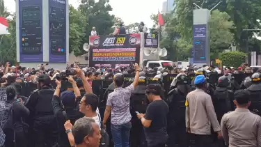 Akibatnya, sejumlah massa tersebut mencoba menerobos barisan aparat untuk merangsak menuju jalan Asia Afrika hingga menyebabkan saling dorong antara pendemo dan juga aparat.