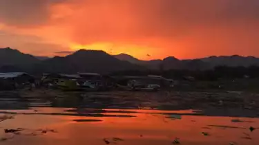 Suasana matahari tenggelam di waduk yang dikelilingi perbukitan, seharusnya terlihat cantik. Namun semua itu sirna karena sejauh mata memandang, terdapat hamparan sampah.
