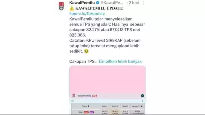 "Dari hasil real count KawalPemilu menempatkan Prabowo-Gibran unggul dengan 58,44%. KawalPemilu memastikan telah menyelesaikan semua TPS yang ada C, hasilnya sebesar cakupan 82.27% atau 677.413 TPS dari 823.366," tulis keterangan KawalPemilu.org seperti dilihat pada akun X resminya, @KawalPemilu_org yang dilihat Rabu, (13/3).
