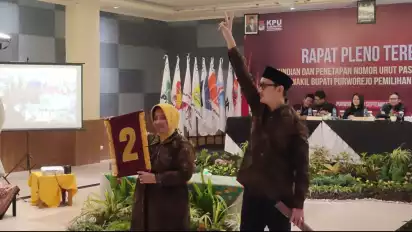 Purworejo, tvOnenews.com - Pasangan calon (paslon) Calon Bupati dan Wakil Bupati Purworejo, Yuli Hastuti-Dion Agasi Setiabudi mendapat nomor urut 2 pada pengundian nomor urut paslon yang maju Pilkada Purworejo 2024.