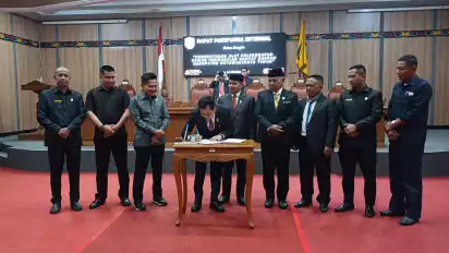 Ketua DPRD Kotawaringin Timur Rimbun menandatangani berita acara pembentukan Alat Kelengkapan Dewan, Senin (14/10/2024).