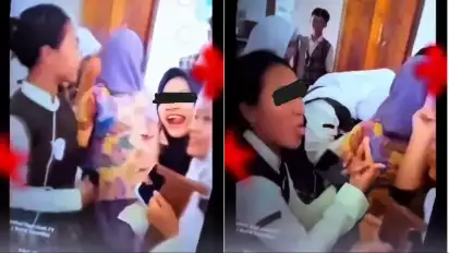Dalam video yang beredar di media sosial, tampak sekelompok siswa mengerubungi seorang guru perempuan.