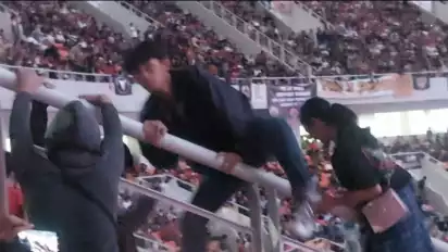 Sejak awal acara, puluhan penonton terpantau sudah menaiki pagar pembatas tersebut.